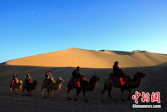 11月1日,敦煌市鸣沙山月牙泉景区在夕阳的映照下,显得更加迷人美丽。 张晓亮 摄