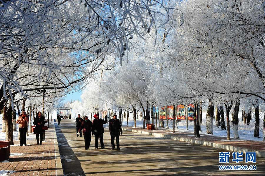 11月3日,在黑龙江省呼玛县一公园内,市民在观赏雾凇景观。 近日,受冷空气影响,黑龙江省部分地区呈现雾凇美景。 新华社发(周长平 摄)