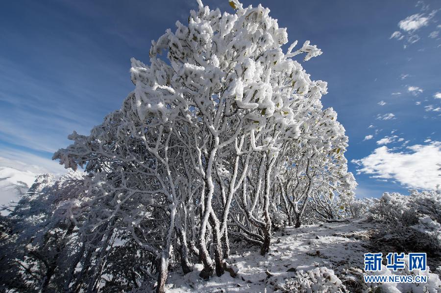 银装素裹的夹金山(11月3日摄)。 11月2日,位于四川省宝兴县和小金县交界的夹金山上下起大雪,山顶、草原和原始森林被皑皑大雪覆盖,一片银装,景色壮美。 新华社记者江宏景 摄
