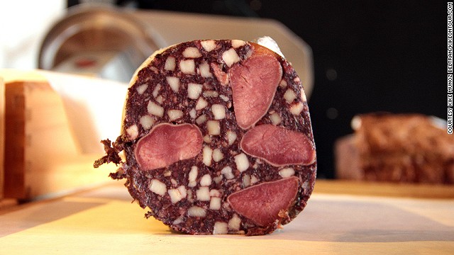 德国肉冻血肠(Zungenwurst) 德国以其1500多种的香肠世界闻名,其中有一种叫做血肠。这种香肠是用动物血、动物舌条、面包屑和燕麦混合制作而成,而肉冻取自猪舌或是牛舌,香肠经过特殊处理可以直接食用,但当地人更喜欢切片加黄油煎着吃。