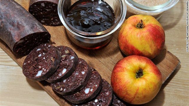 丹麦甜香肠(Danish Blodpose) 丹麦甜香肠除了加入一般肉类外,还加了牛奶、糖、葡萄干以及小豆蔻,混合以牛脂。这种甜香肠的出现颇具历史原因,以前糖不是甜味剂,只是为了提味而使用,所以若在香肠里加糖,食用起来味道更好。这种甜香肠上桌的时候还配以炖苹果和黄油肉桂,或者蘸着糖浆一起吃,好像一餐所有的食物都包在一层薄薄的肠衣里了,谁能抗拒这种美味的诱惑?