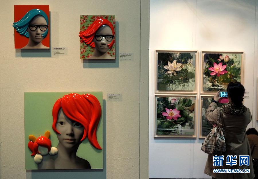 11月12日,韩国参展画廊作品亮相上海艺术博览会预展。 11月13日,第十八届上海艺术博览会在沪开幕。来自中国、西班牙、德国、法国、美国、俄罗斯、乌克兰、英国、荷兰、加拿大等12个国家的148家画廊携数千件国画、油画、雕塑、版画、影像、装置、陶瓷等艺术品参展。本届艺博会主题为“收藏就是时尚”,既有身价高达450万的大师典藏名作,也有青年艺术家作品,更有艺术衍生品和限量复制作品,参展画廊充分考虑上海本土藏家和艺术品消费者的口味与爱好,不仅在价格定位上亲民,在作品样式和风格挑选上也极具亲和力,旨在吸引更多年轻人进入艺术品收藏市场。新华社记者 任珑 摄