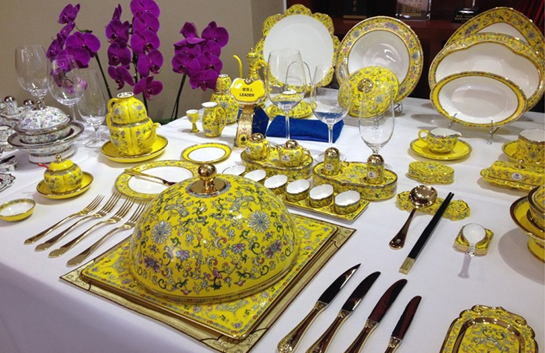 然后是富丽堂皇的“帝王黄”国宴瓷。11月10日,APEC国宴在奥运会场馆“水立方”举行,此次欢迎晚宴所使用的餐具,并不似以往国宴中使用的偏素色餐具,帝王黄的珐琅彩瓷在国宴主桌上异常抢眼。据介绍,这套餐具是以《诗经》中词句“和鸾雍雍万福攸同”寓意为主题设计,专为APEC国宴而作,“和鸾是车马上的铃铛,在设计的主体纹样中为磬纹,宝磬是礼乐之器,有祝福之意。和鸾雍雍,万福攸同,宾客至,同多福。”据介绍,主桌以金黄色为主色调,每人需用到68件餐具。