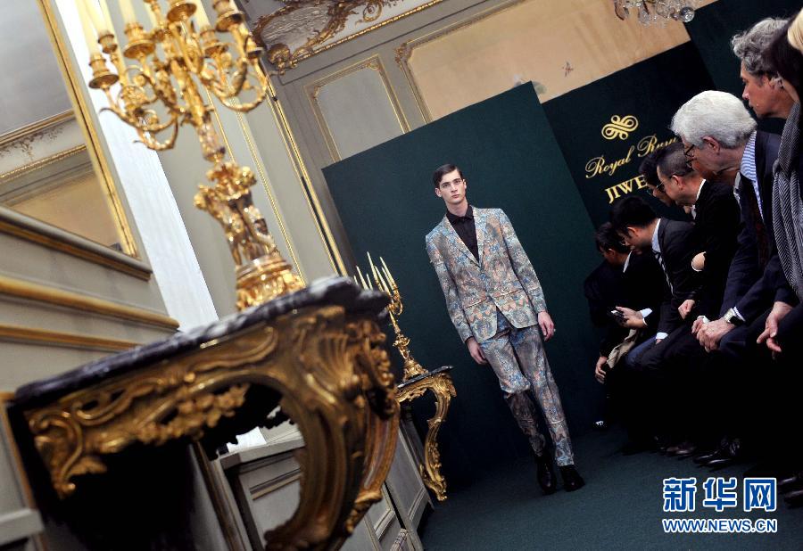 11月13日,在法国巴黎旺多姆广场,模特展示时装。为纪念中法建交50周年,助兴当日在法国首都巴黎召开的中法时尚峰会,以设计时尚男装闻名的JIWENBO高级成衣品牌发布会在巴黎旺多姆广场举行。新华社记者陈晓伟摄