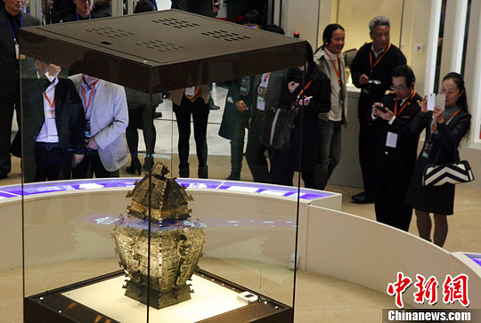 11月14日,历经百年分离终回故土的中国青铜重器“皿方罍”在湖南长沙首次面向公众完整展出。中新社发 邓霞 摄