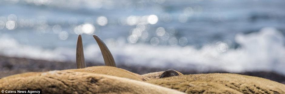 图为一只海象从岩石后露出牙齿。(网页截图)