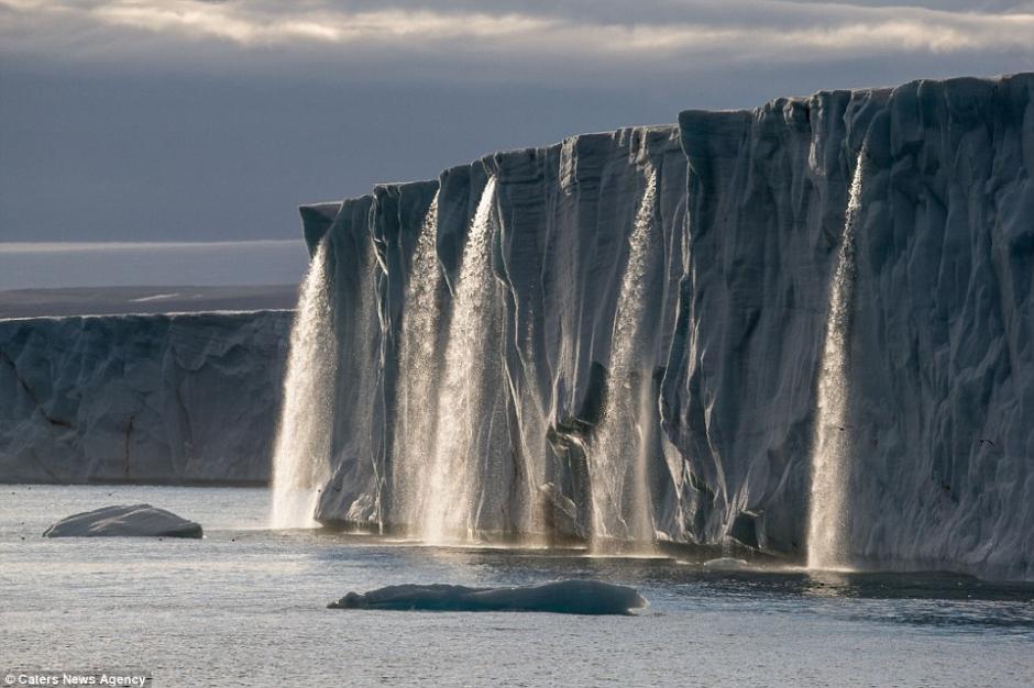 图为雄壮陡峭的Brasvellbreen冰壁,消融的冰水正从悬崖上流下。(网页截图)