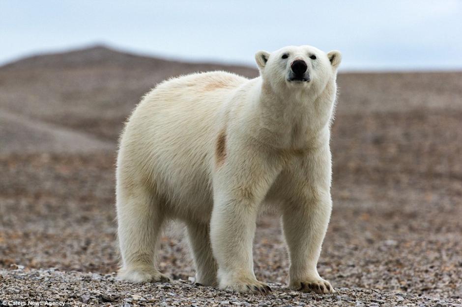 图为一只雌性北极熊面对镜头做出防御姿势,以保护她的领地。(网页截图)