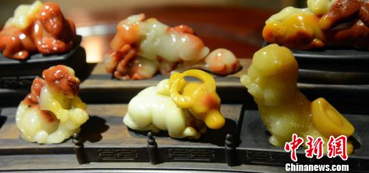 11月25日,由福州青年雕刻家采用寿山结晶芙蓉石创作、雕刻而成的卡通造型寿山石十二生肖精品,首次在福州寿山石文化城展出,吸引寿山石爱好者的眼球。刘可耕 摄