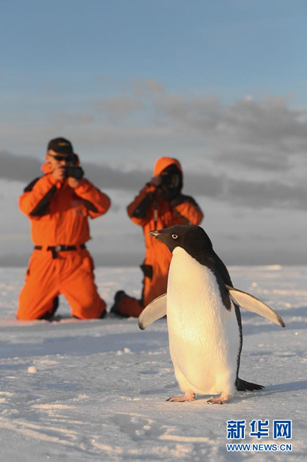 12月26日,科考队员与造访中山站的阿德雷企鹅热情“互动”。企鹅是南极代表性生物,在南极中山站附近,有很多阿德雷企鹅出没,给在中山站工作的科考队员们增添了许多乐趣。 新华社记者 白阳 摄