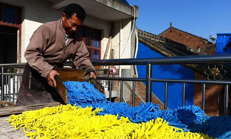 图为木斗里的粉笔经过二十分钟左右的放置后,就可以端到外面摊放在竹制的架子上晾晒。任之 摄 图片来源:西部网