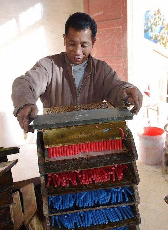 图为浆液在模具里静置四五分钟,就凝固成了粉笔,把模具翻个面,放到簸箕状的木制斗上。 任之 摄 图片来源:西部网