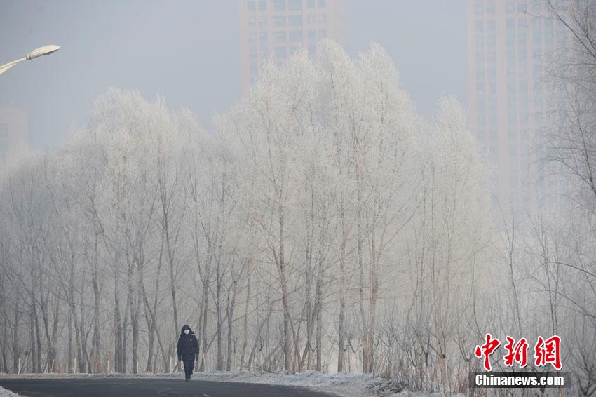 1月22日,吉林省长春市迎来了进入2015年之后的第一场大范围雾凇美景,街路旁的树枝、草坪上挂满白色冰凌花,远处的建筑物在雾凇的掩映下若隐若现,整个城市宛如一幅水墨画,颇为壮观。略微让人遗憾的是,雾霾天气的出现影响了人们欣赏美景的心情,与雾凇同时出现的还有达到重度污染的雾霾天气。根据中国环境监测总站22日9时发布的数据,长春市空气质量指数(AQI)达到了249,属重度污染。 张瑶 摄