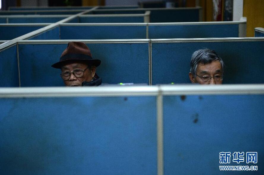 在南昌的一家证券营业部里,结伴而来的两位股友在隔间里看盘(1月20日摄)。万象 摄 图片来源:新华网