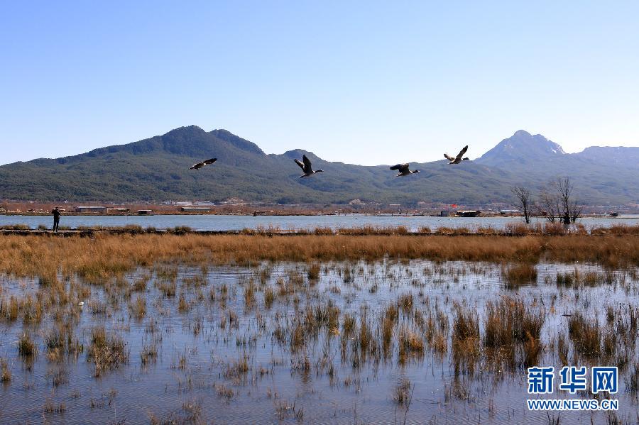 1月21日,游客在拍摄拉市海湿地飞禽。拉市海位于丽江西10公里处的拉市坝中部,是云南省第一个以“湿地”命名的自然保护区,常年吸引不少游客慕名而来。 新华社发(张燕辉摄)