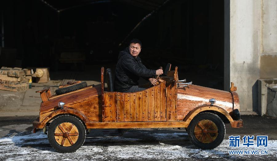 刘福龙坐在他的第二辆木质汽车里(1月20日摄)。新华社记者 姚剑锋 摄