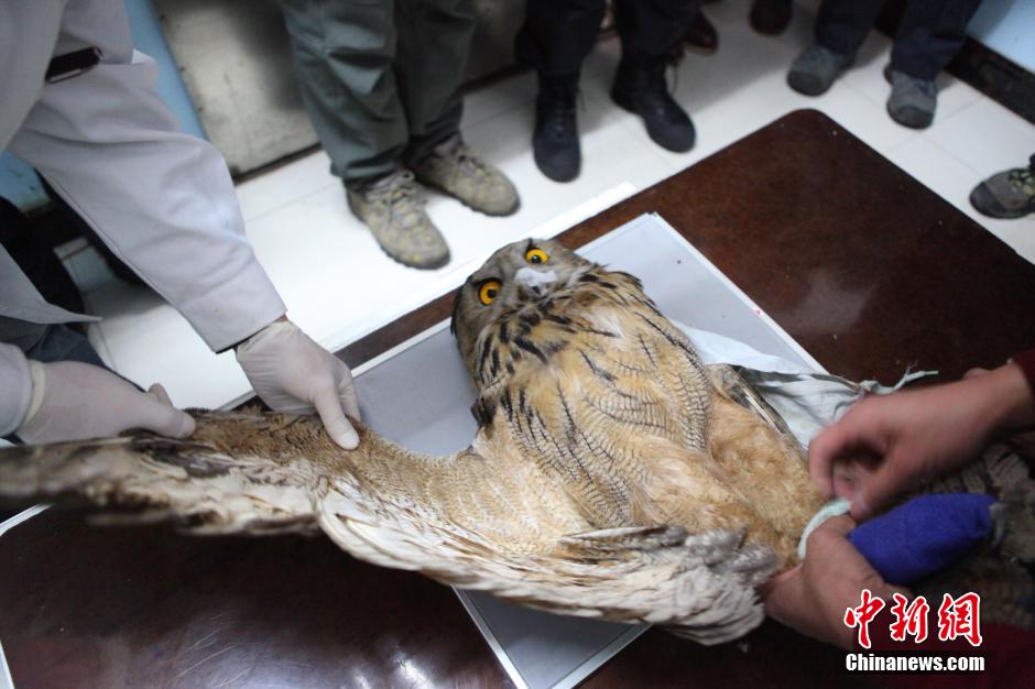 1月20日,沈阳某宠物医院医生正在为受伤的雕鸮(猫头鹰)做手术。当日,沈阳猛禽救助中心的志愿者联合这家宠物医院,成功地为他们19日在沈阳法库县救助的一只翅膀关节处受伤骨折的国家二级保护动物雕鸮(猫头鹰)实施手术。据悉,这种手术的成功在国内尚属首次。图为1月20日,沈阳某宠物医院医生正在为受伤的雕鸮(猫头鹰)拍X光片。 中新社发 赵敬东 摄