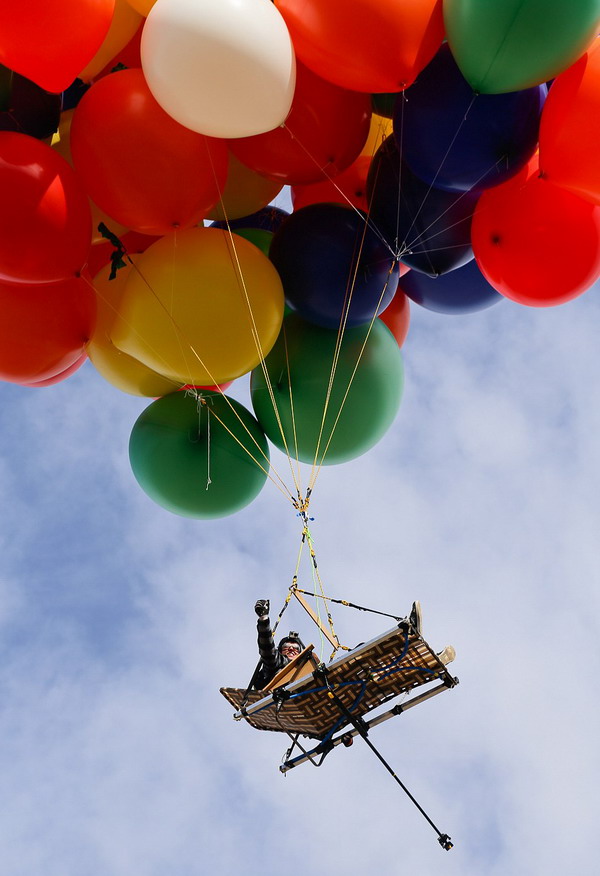 在最新特技表演中,罗纳使用50罐氢气创造了一个简易“飞屋”,家人和朋友帮助罗纳将数十只颜色亮丽的气球绑在躺椅上。