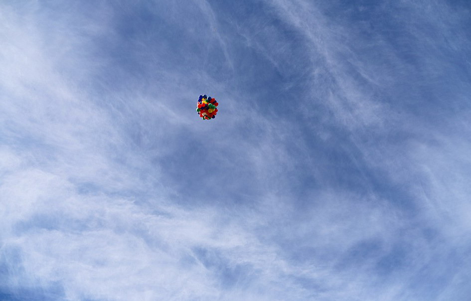 罗纳坐在躺椅中随着气球升空(网页截图)