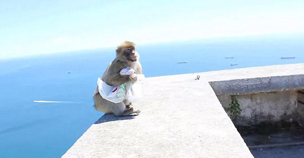 偷窃得手后,这只猴子立刻跳上墙头。