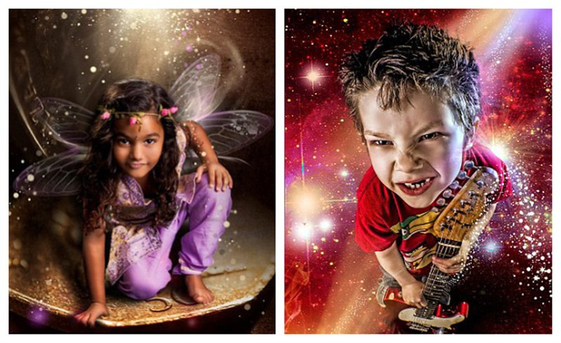 左图中,4岁女孩莎哈娜·霍伊勒(Sahana Hoyle)变身仙女。右图中,7岁男孩科迪·钱伯斯(Cody Chambers)化身摇滚明星。