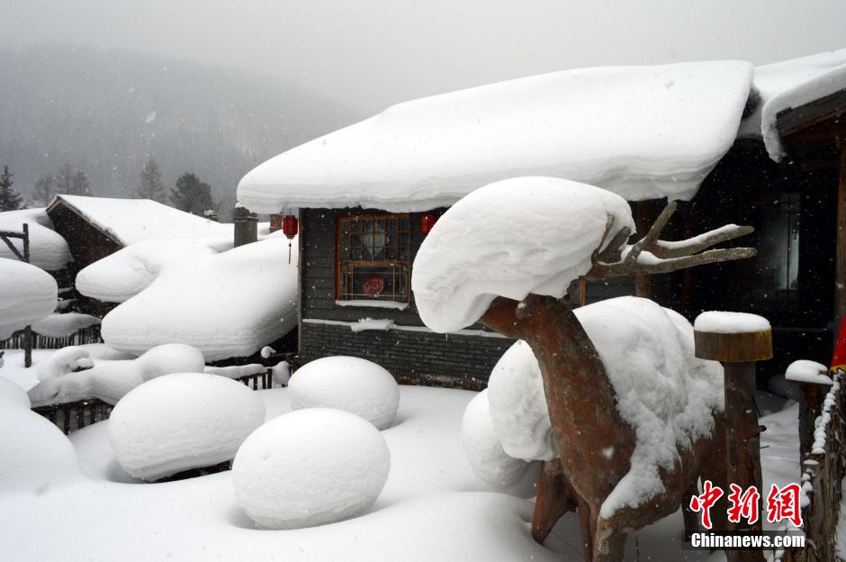 1月26日,中国180家旅游企业的代表抵达“黑龙江省冬季冰雪旅游推介会”最后一站——位于牡丹江市大海林林业局双峰林场的雪乡。雪乡降雪量大、雪期长、雪质粘,积雪随物具形,千姿百态。当天,雪乡瑞雪纷飞,白雪好似上帝在人间挤下的“奶油”,将这座静谧的小村落包裹成诱人的“奶油蛋糕”。 中新社发 王琳 摄