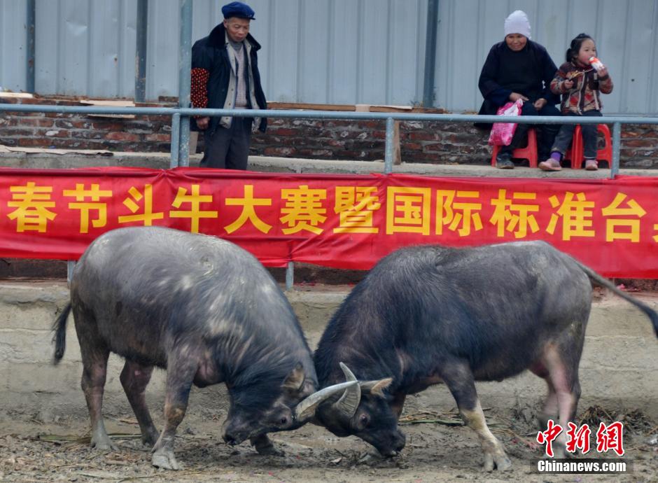 2月14日,广西三江侗族自治县独峒乡平流村举办首场迎春斗牛比赛,当地20头牛王展开激烈角逐,引来不少群众前来观赏。侗族百姓喜好斗牛,每到逢年过节均举办激烈的斗牛比赛,祈福来年喜获丰收。图为斗牛比赛现场。龚普康 摄