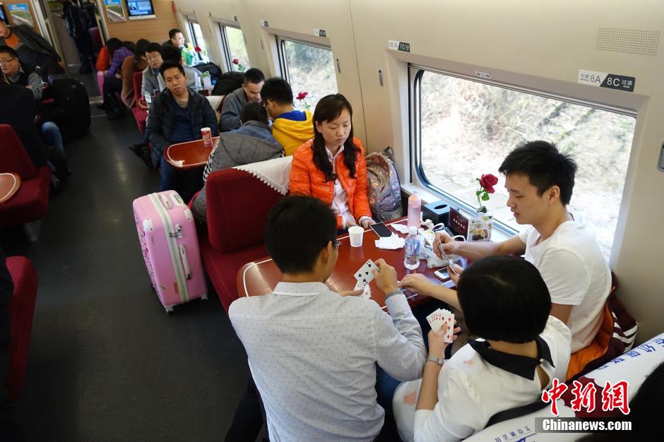 深圳北站至北京西站约2158公里。2月15日,回家过年的旅客早晨7:53分 乘高铁G72一路向北。列车满载乘客高速行驶在京深铁路线上,时速曾高达310公里飞奔,列车穿行在广东、湖南、湖北、河南、河北大地,一路阅尽南北风光,全程行驶约10小时27分。朝发夕至,回家过年的感觉真好。也有旅客感叹:高铁快捷舒适,就是有点贵,如果车厢里有WI-FI那就更好了。 中新社发 陈文 摄
