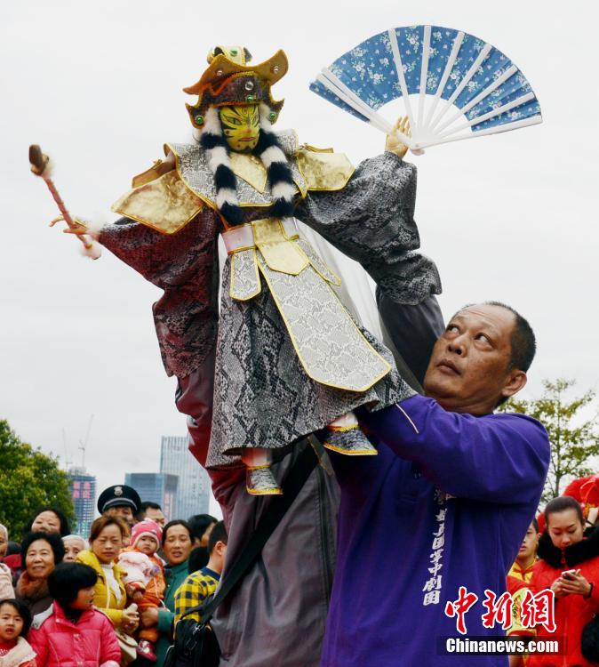 台湾高雄如真园掌中剧团团长陈志清等为观众表演变脸布袋戏,惊艳全场。刘可耕 摄