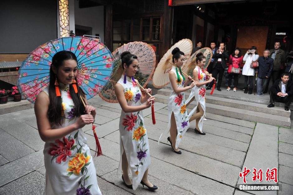 福建展出台湾手工艺品 旗袍美女撑精美油纸伞
