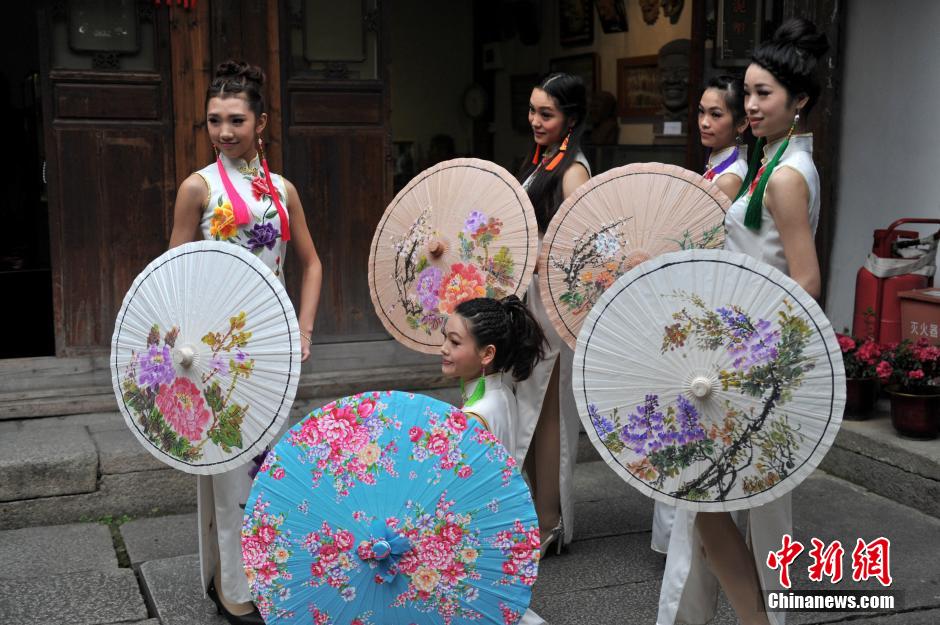 福建展出台湾手工艺品 旗袍美女撑精美油纸伞