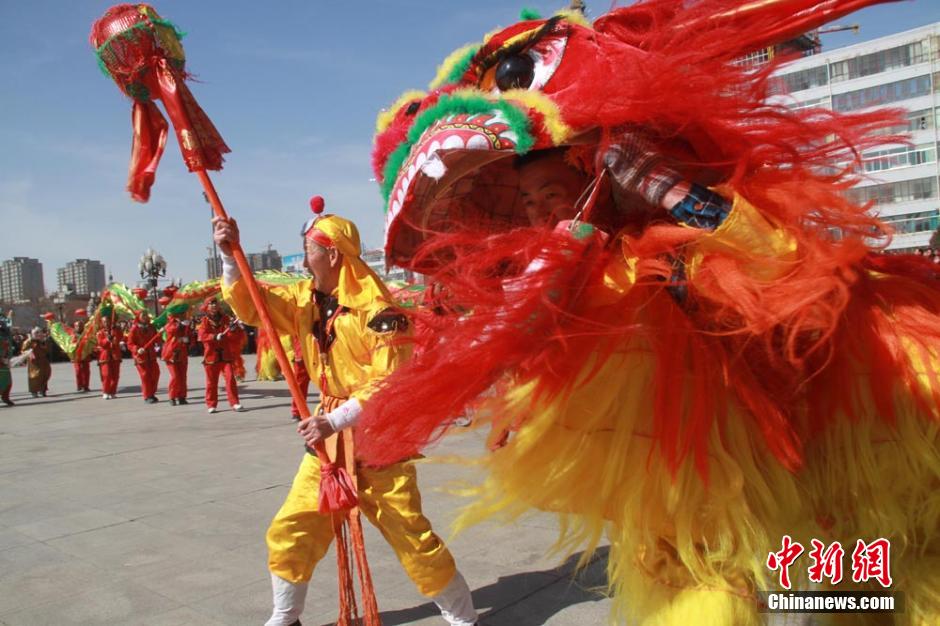 3月3日,中国农历正月十三,张掖甘州区安阳乡社火队在表演传统社火。陈礼 摄