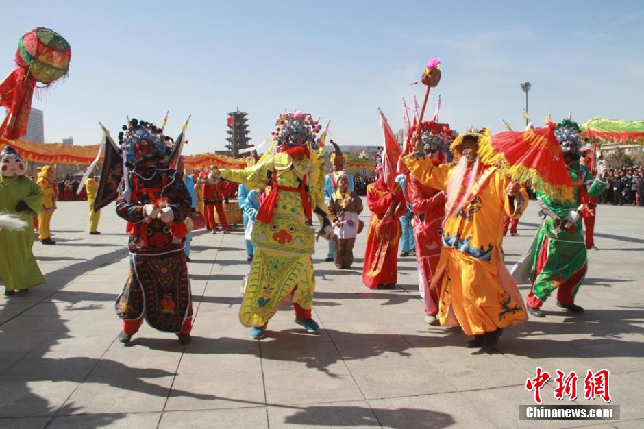 甘肃古城张掖农民上演传统社火庆羊年