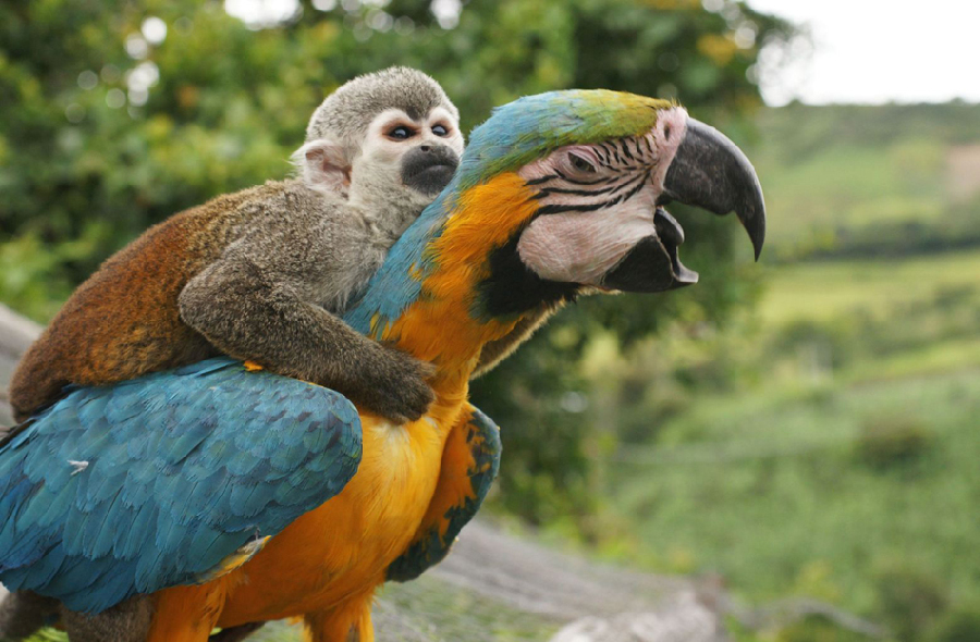 下面这些摄影作品中,摄影师们就拍下了一只小猴子骑在一只大鹦鹉背上的情景。另外一些照片则展示了一些完全无法被联系在一起的动物物种们之间上演的“背背秀”,仿佛两个伙伴间要进行一场森林冒险,让人忍俊不禁。(米粒)