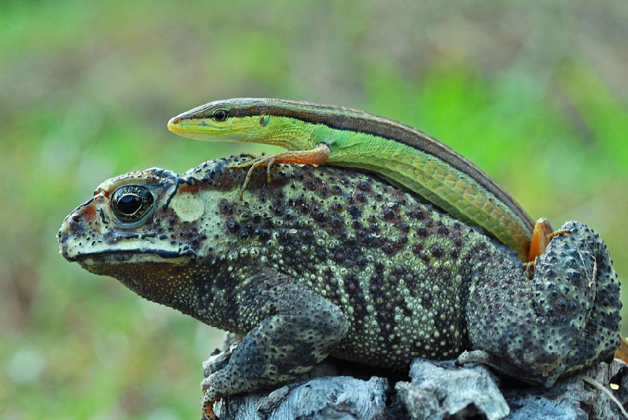 一条蜥蜴爬在一只蟾蜍的背上。