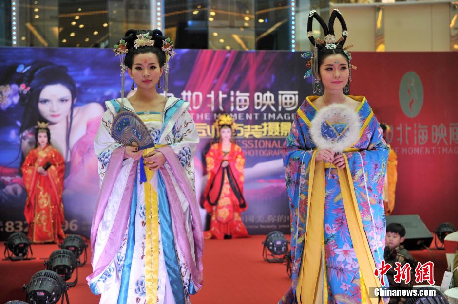 3月8日,福州某商场上演一场古装美女走秀,吸引许多顾客围观。 图为走秀现场。 吕明 摄