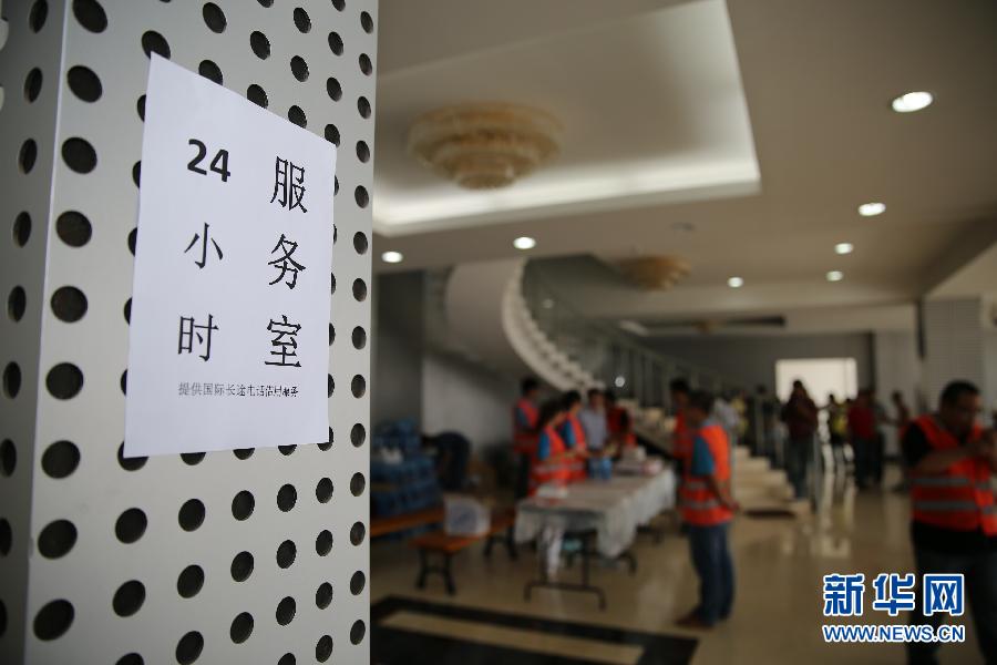 3月31日,在位于吉布提首都吉布提市的中方人员临时安置点,志愿者们在服务室工作。当日,第二批449名撤离也门的中国公民乘坐中国海军护航编队护卫舰潍坊舰平安抵达吉布提共和国吉布提港。这次抵达的撤离人员大部分被安置在阿泽谷雷体育场的临时安置点,进行休整,准备回国。新华社记者潘思危摄
