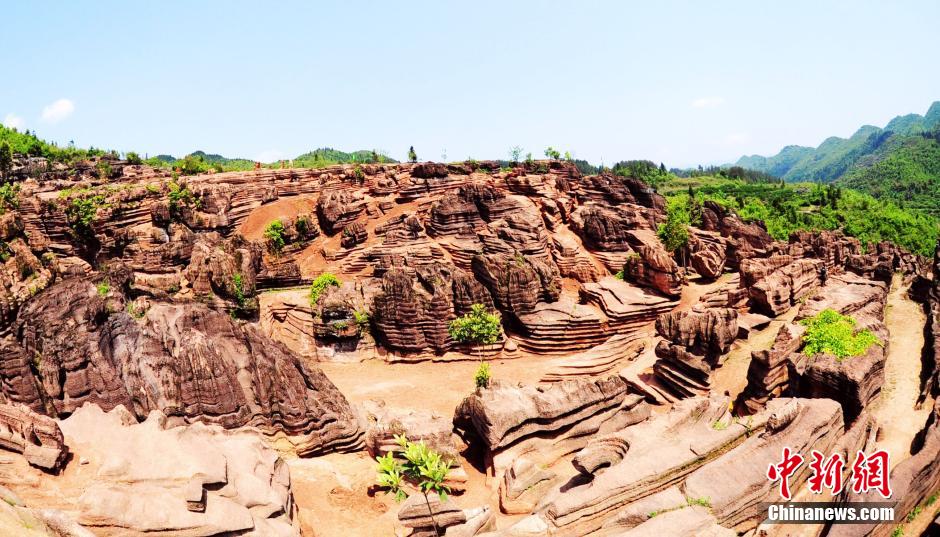 近日,几位摄友在重庆酉阳麻旺镇白竹村被大面积的红石林吸引。这些红石林以岩溶地貌、峡谷地貌、地层剖面、古生物化石为主,很有地质研究和观赏价值。红石林地区距离酉阳县城50公里,目前该县相关部门正在着手进行保护工作。据正在着手开发这个景区的负责人介绍,目前已经开挖出来的有600多亩,还有几百亩没有进行开挖。图为红石林吸引游客观赏拍摄。 陈碧生 摄