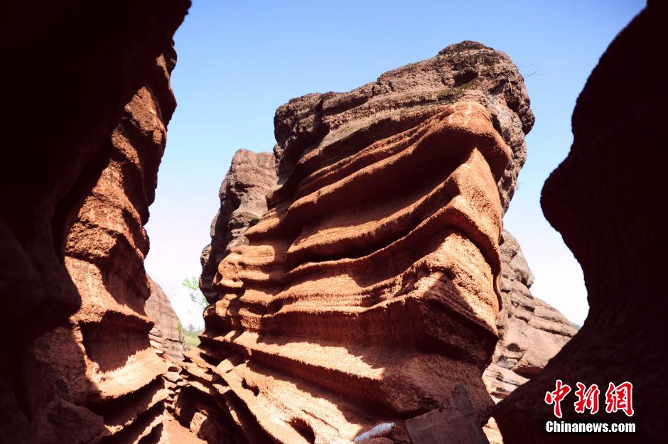 图为红石林吸引游客观赏拍摄。 陈碧生 摄