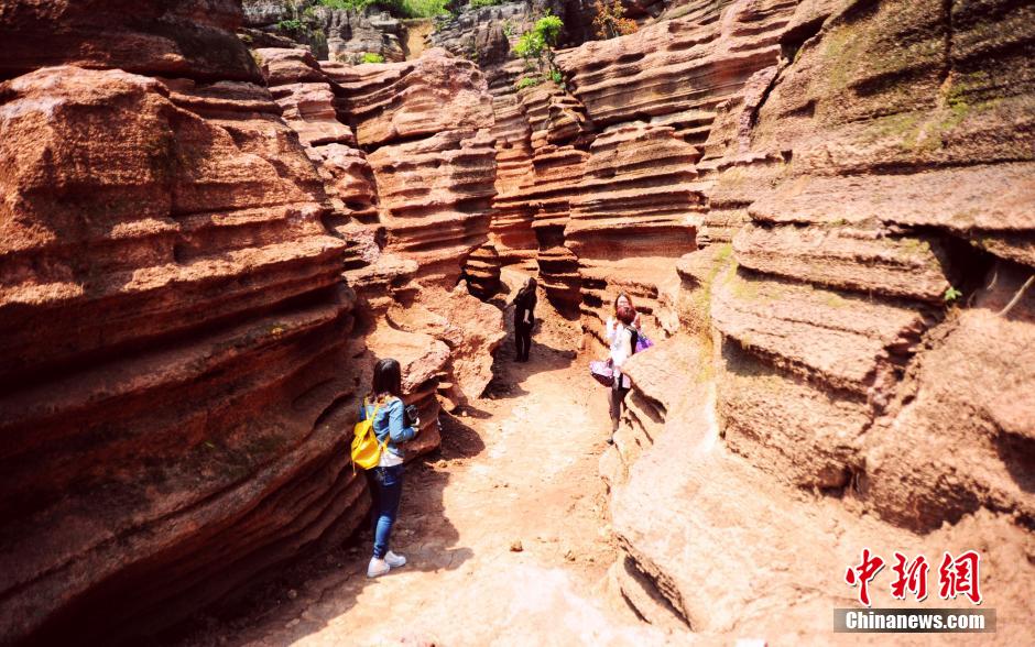 图为红石林吸引游客观赏拍摄。 陈碧生 摄