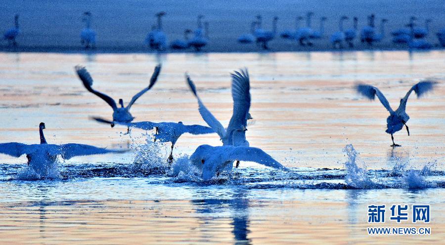 4月22日清晨,天鹅在内蒙古西乌珠穆沁旗巴音胡硕苏木草原的湖面上飞翔。