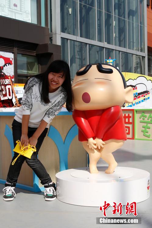 4月22日,游客与蜡笔小新合影。“蜡笔小新25周年纪念特展”日前在北京开展,吸引了不少市民游客。据悉,此次展览集合了近50组身高105公分的1:1比例的蜡笔小新,是国内最大规模的小新主题展览,展览将持续6月22日。中新社发 李慧思 摄
