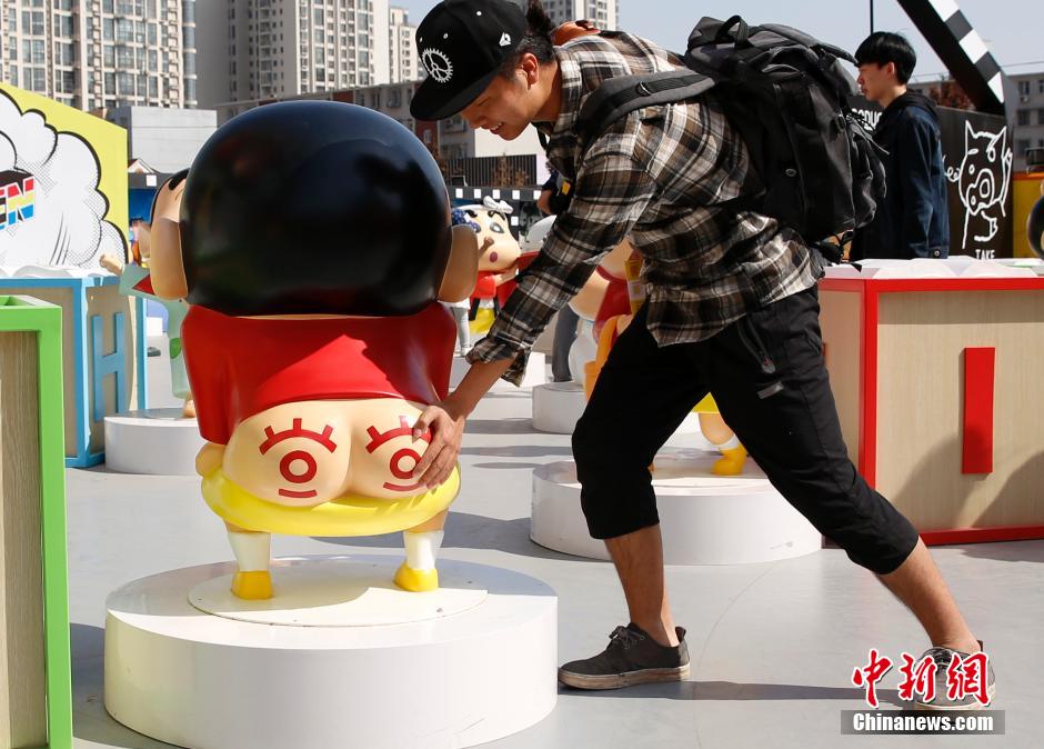 4月22日,游客与蜡笔小新合影。“蜡笔小新25周年纪念特展”近日在北京开展,吸引了不少市民游客。据悉,此次展览集合了近50组身高105公分的1:1比例的蜡笔小新,是国内最大规模的小新主题展览,展览将持续6月22日。有媒体日前爆出《蜡笔小新》被美国禁播,原因之一是“动不动就露出屁股”。中新社发 李慧思 摄