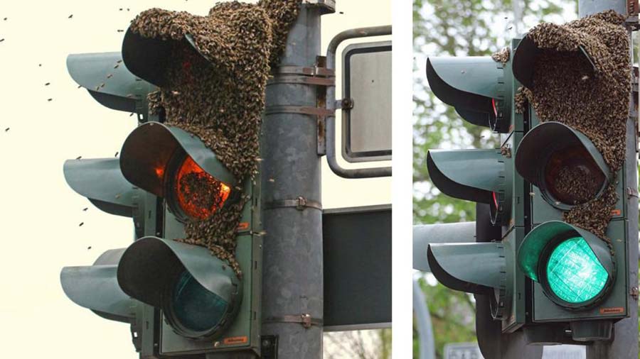 图为被蜜蜂包围的信号灯,已经失去了指挥交通的功能。
