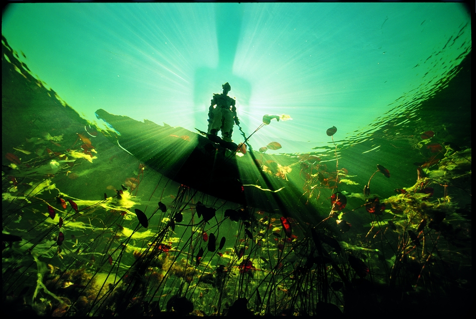 照片从鳄鱼的视角仰视,可以看见光线在充满了百合花的水中世界里弥漫开来,而一个布什曼人正往下细看奥卡万戈河的洪水。在这条河消失蜕变为卡拉哈里沙漠的沙砾之前,它的水量会随季节高涨或低减,为南非各种野生动物提供栖息之地,其中包括狮子、大象、水牛、鳄鱼和河马等,河马只要大嘴喀嚓一下,就可以将独木舟咬成两段。