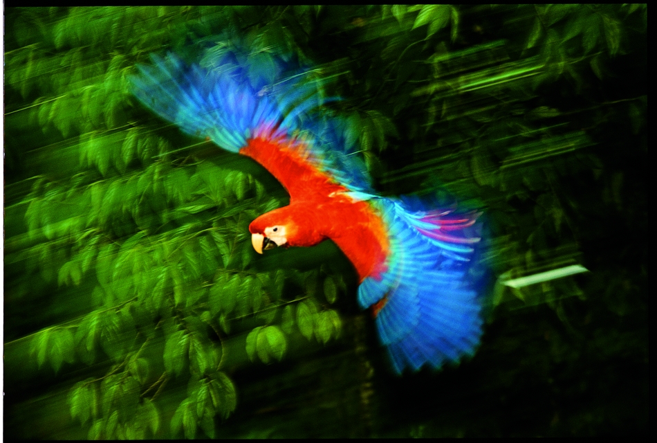 秘鲁亚马逊地区,一只飞翔的金刚鹦鹉展示它3英尺宽的翅膀。伐木、采矿和农耕正在吞噬金刚鹦鹉的栖息地。