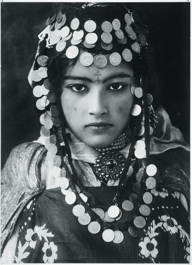 她的脸上有指甲花染的花纹,眼睛周围上了化妆墨粉,她凝视的眼神中有直白的诱惑。这个乌列奈尔(Ouled Nail)部落的女孩是众多离开阿尔及利亚(Algerian)山区,在法属北部非洲那些拥挤的咖啡馆里表演迷人的肚皮舞的姑娘之一。她们赚来的大笔收入用来买珠宝也当嫁妆,最终回到沙漠中的老家并安顿妥当后,她们开始寻觅夫婿。