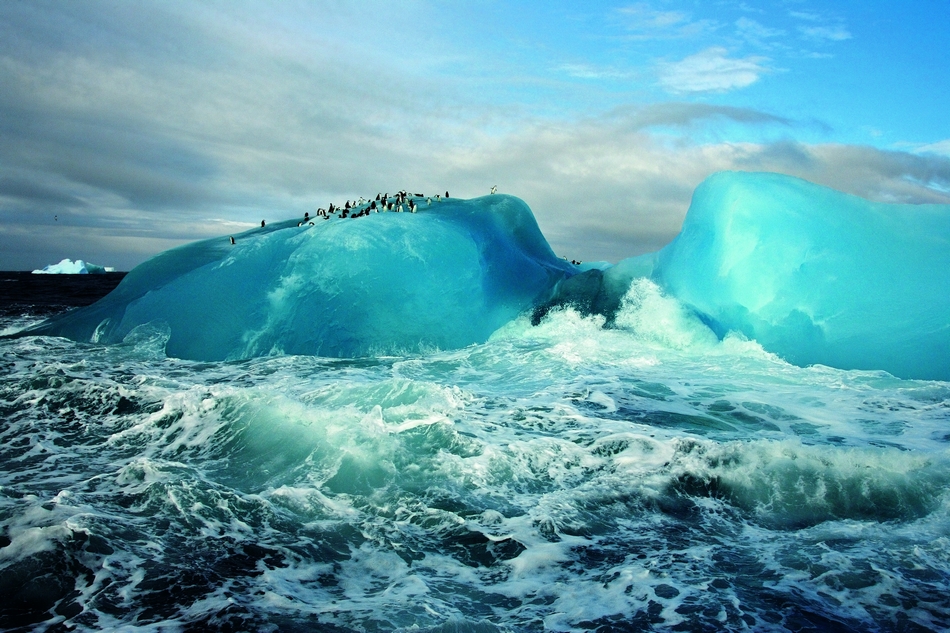 南极洲附近的圣烛节岛上的帽带企鹅停留在一块蓝色冰山顶端,以这块被侵蚀的冰山作为临时休息点。一年中的大部分时间,浮冰在南桑维奇群岛保持着平静,但是在为期约4个月的南半球夏季,浮冰会出现短暂的解冻。