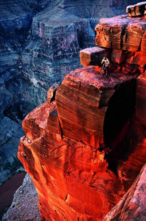 迈克尔 尼科尔斯在”托洛维组高地”(Toroweap Overlook) 的一块平台上支起了三脚架,准备拍摄大峡谷(Grand Cayon)。他的挑战是用一种全新的方式拍摄到如同大峡谷本身一样“ 经典”的照片,至少超脱一般人常见的视角,“试过所有的陈词滥调,你就能做出真正的好东西来。”他说,“技术上的难度超乎寻常,但我不希望任何人看到照片时去在意技术的部分。它应当属于精神层面的冲击。”