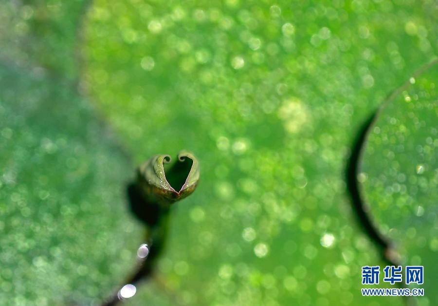 这是5月15日在位于淮河下游的江苏省淮安市盱眙县拍摄的荷叶嫩叶。初夏时节,沿淮水系中的荷叶嫩叶竞相萌发。微距镜头下的嫩叶宛如“心”形,含“笑”而立。 新华社发(周海军 摄)